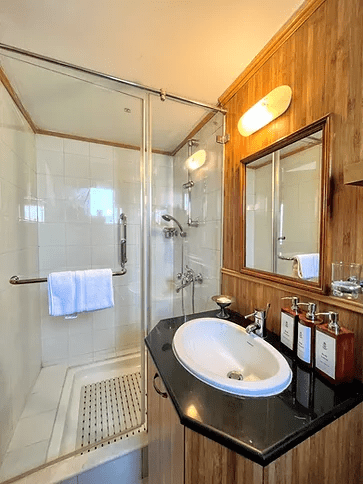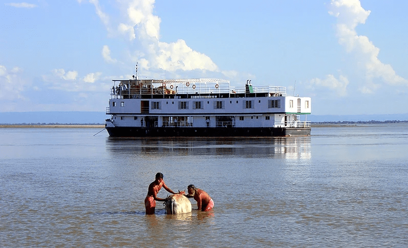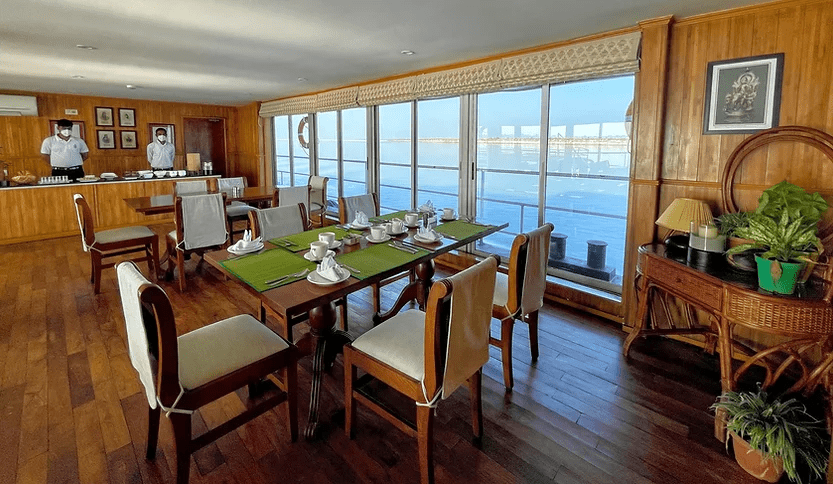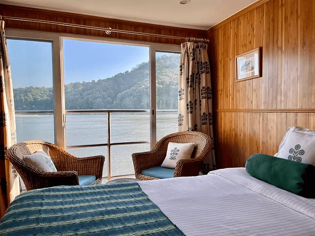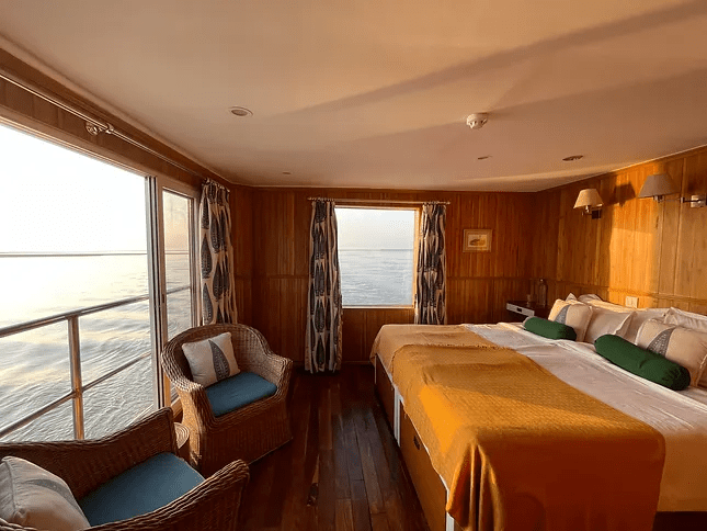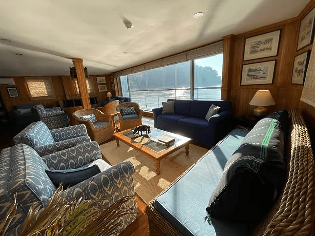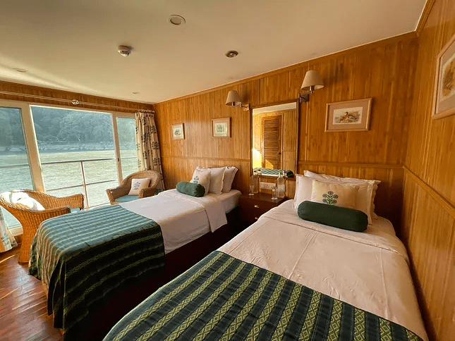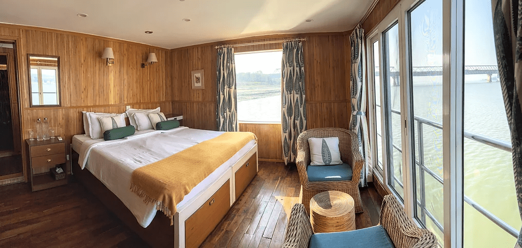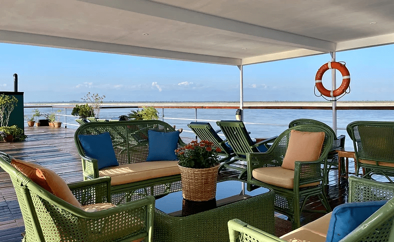 In an effort to conserve India’s forests, her 12 upper deck cabins are bamboo-paneled, air-conditioned and roomy with en suite bathrooms; these cabins also have large, sliding windows that offer panoramic views of the river. There is a spa and a saloon with a library. The dining room is on the main deck and a spacious sundeck at the very top. Cane furniture on board, objet d’arts and handlooms on the ship are all locally made by talented artisans from Assam.